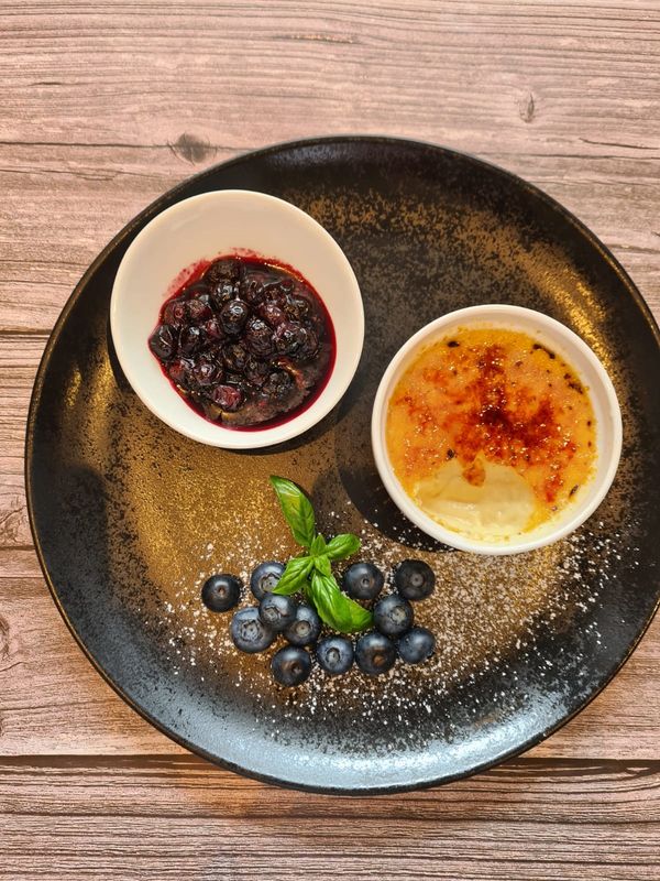 Für die Karamellschicht kurz vor dem Servieren je einen Esslöffel Zucker auf der Créme teilen und mit einem Flambierbrenner goldbraun schmelzen lassen. Das Karamell wird durch die kühle Creme sofort fest. Nun direkt mit dem warmen oder auch abgekühlten Blaubeerkompott servieren.