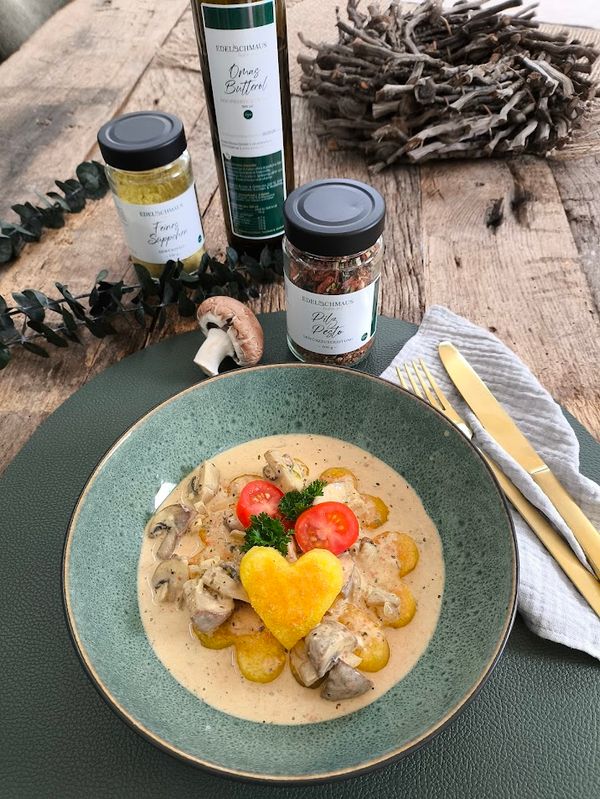 Die Champignons putzen und vierteln. Die Zwiebel in feine Würfel schneiden und in einer Pfanne in Omas Butteröl andünsten. Die Chmapignons dazugeben und gut anbraten. Pilz Pesto und Feines Süppchen dazugeben und mit der Sahne aufgießen. 10 Minuten köcheln lassen. Zum Schluss die Crème fraîche einrühren und mit Regenbogen Pfeffer abschmecken.