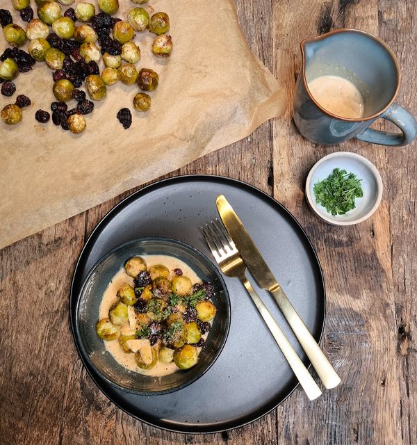 Den Rosenkohl waschen, die äußeren Blätter entfernen und die Röschen je nach Größe halbieren. Mit Griechischen Olivenöl, Meersalz und Regenbogen Pfeffer nach Geschmack marinieren, auf ein Backblech geben und die Cranberries darüber verteilen. Für 20 bis 25 Minuten bei 200 Grad Ober-/Unterhitze im Ofen goldbraun backen.
